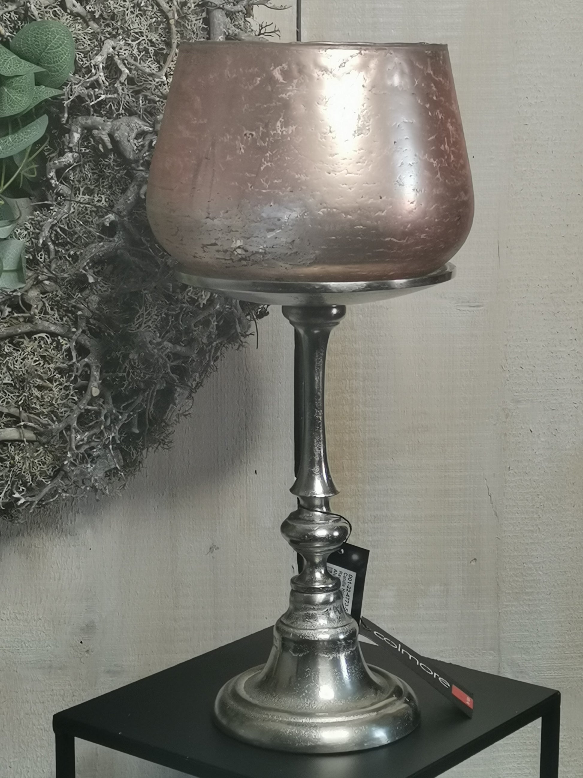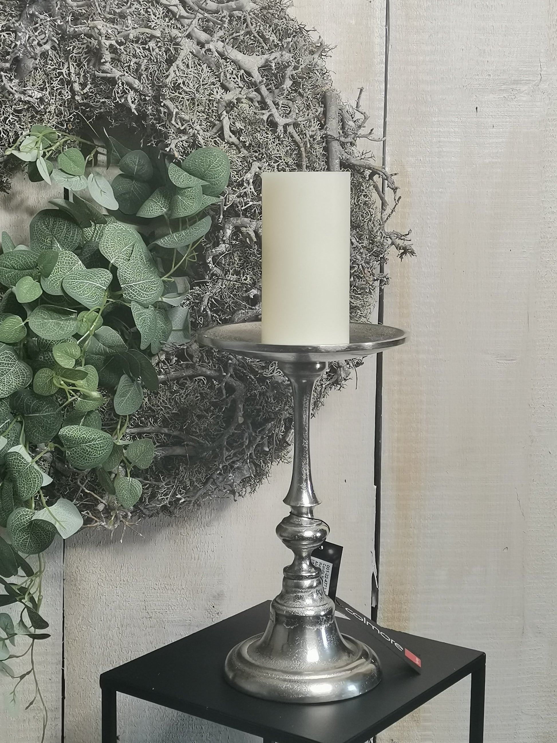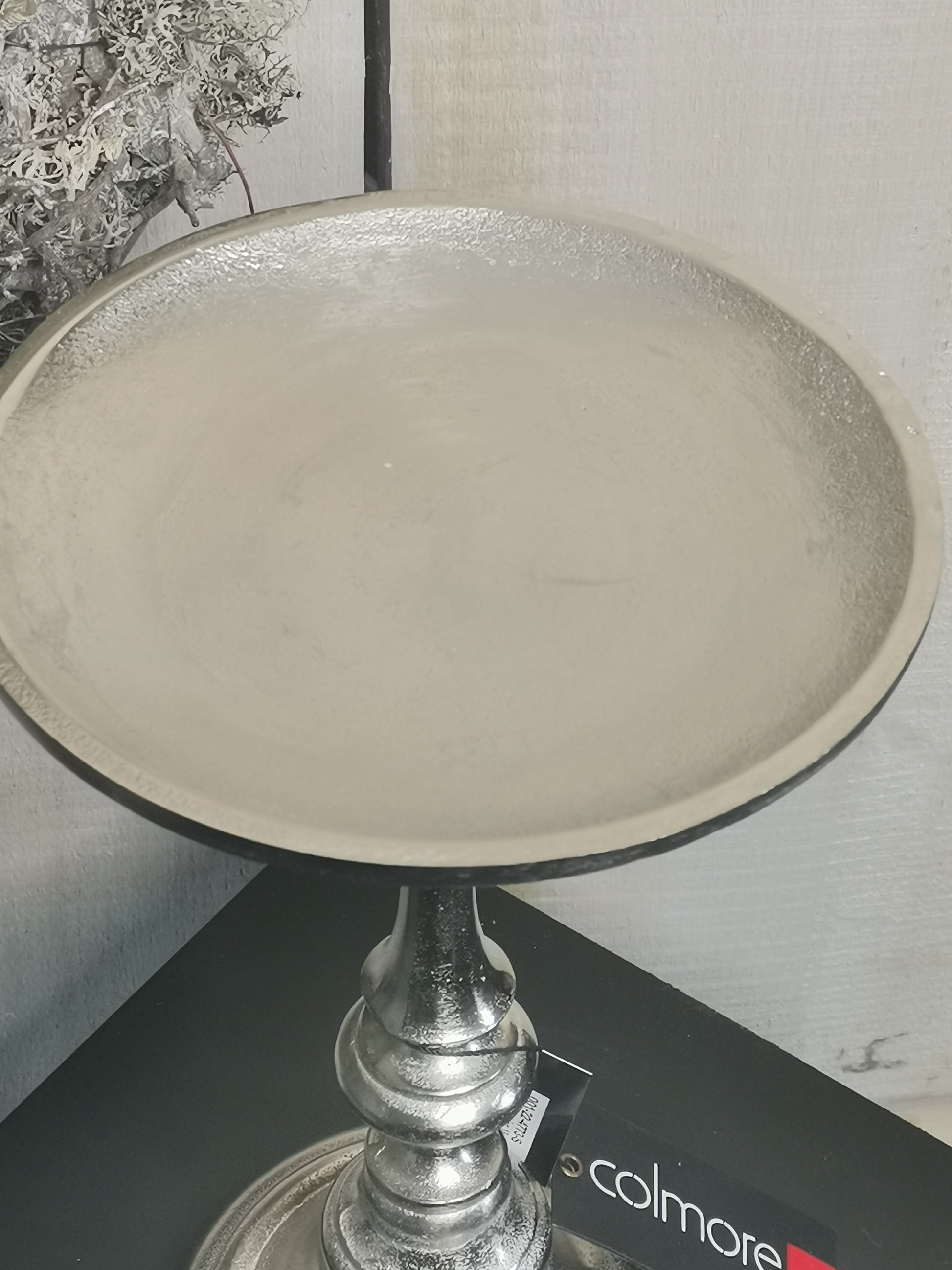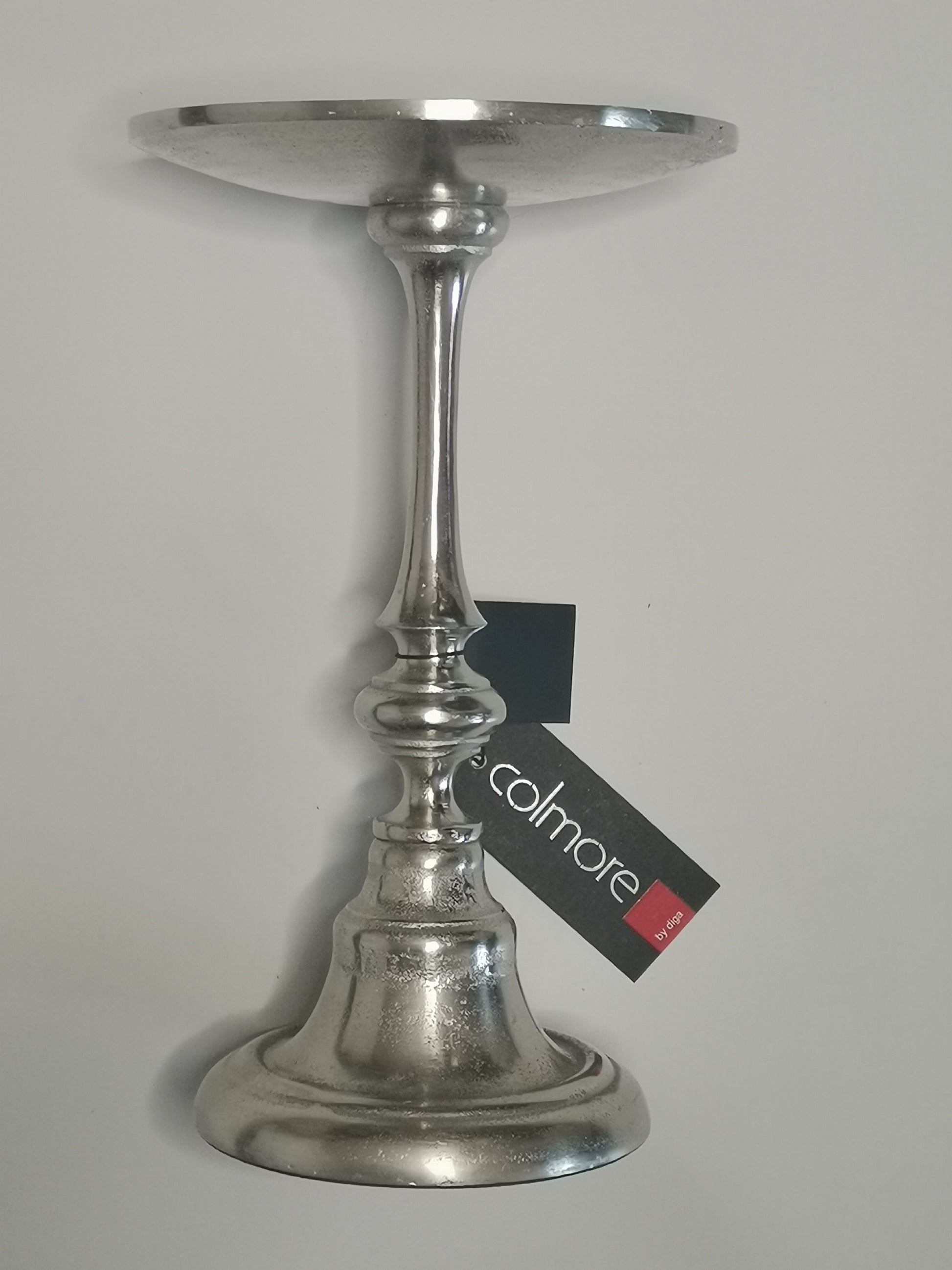 Zeitlos eleganter Kerzenständer aus dem Hause Colmore mit einer Höhe von 30 cm, Fuß Durchmesser 14 cm und die obere Schale hat einen Durchmesser von 18 cm. Der Kerzenständer aus Alu, in der der Farbe Silber im RAW finish, ist in jedem Wohnbereich ein echter Hingucker. Besonders ist die große obere flache Schale. Hier findet nicht nur eine große Kerze ihren Platz, man kann auch wunderbar ein Windlicht darauf platzieren. Auch ein echtes Highlight in Kombination mit frischen Blumengestecken(separates Gefäß zum draufstellen) für feierliche Anlässe.