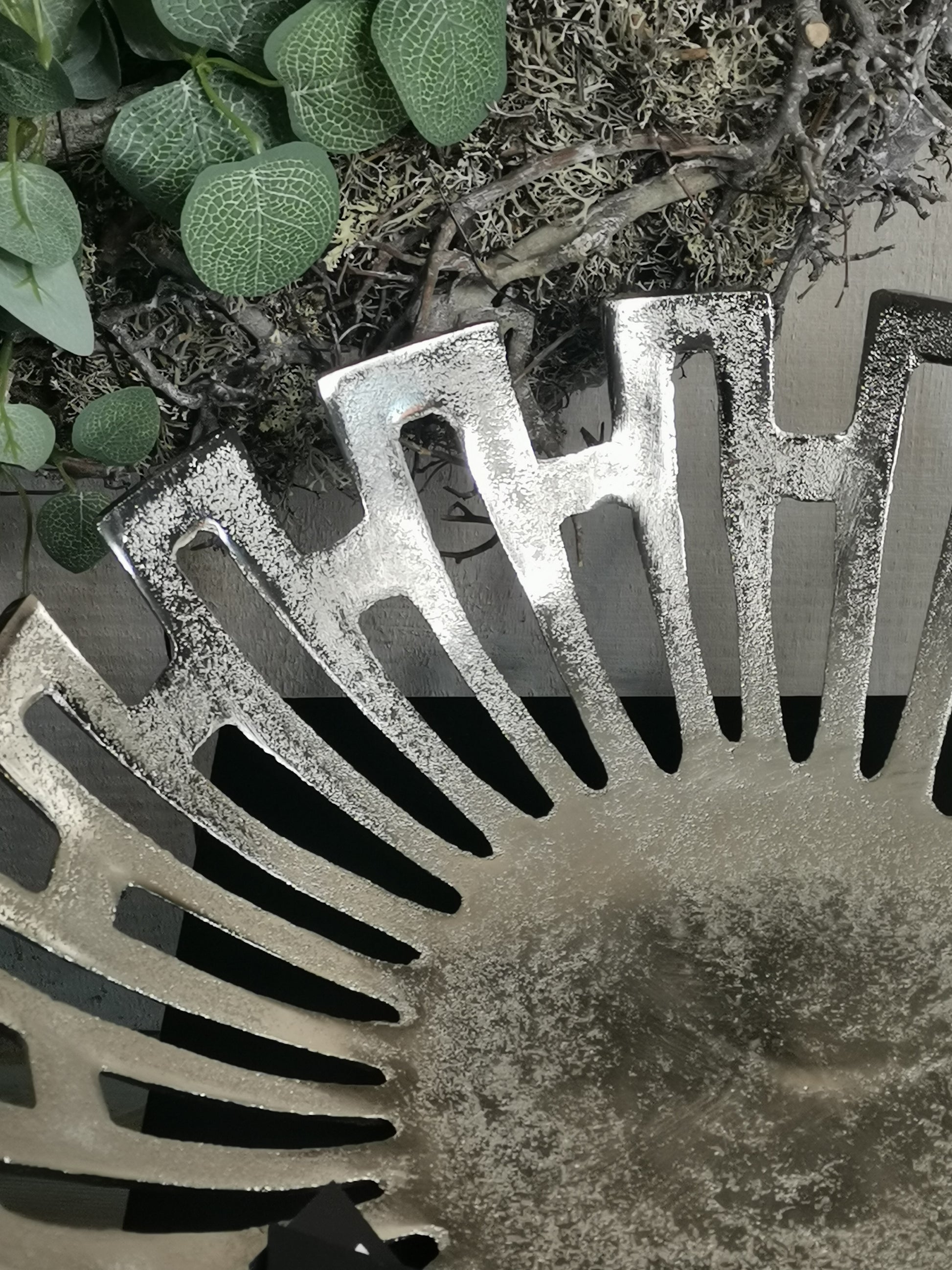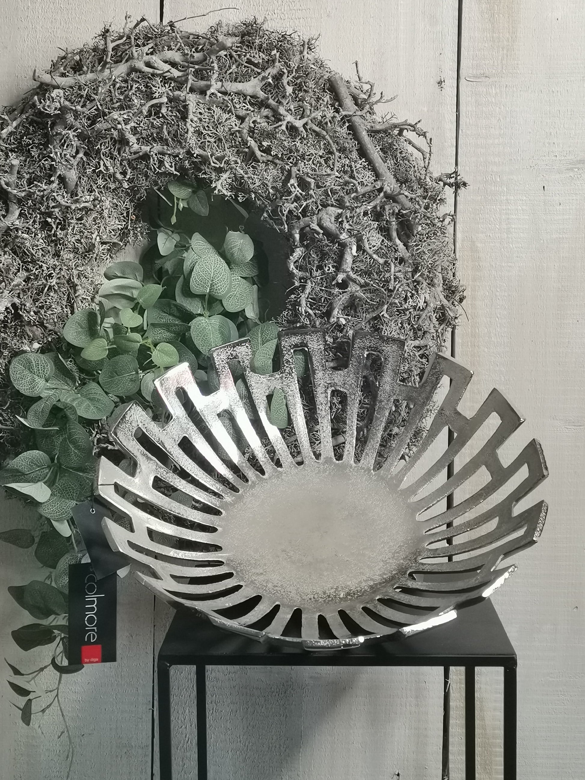 Zeitloses Design zeigt diese Schale aus dem Hause Colmore, mit einem Durchmesser von 41 cm und einer Höhe am Rand von 11 cm. Diese auffällige Schale aus Alu, in der der Farbe Silber im RAW finish, ist in jedem Wohnbereich ein echter Hingucker. Die Schale passt hervorragend auf eine Kommode oder Tisch Da in der Mitte der Schale der Boden geschlossen ist, kann hier eine tolle Deko ihren Platz finden.