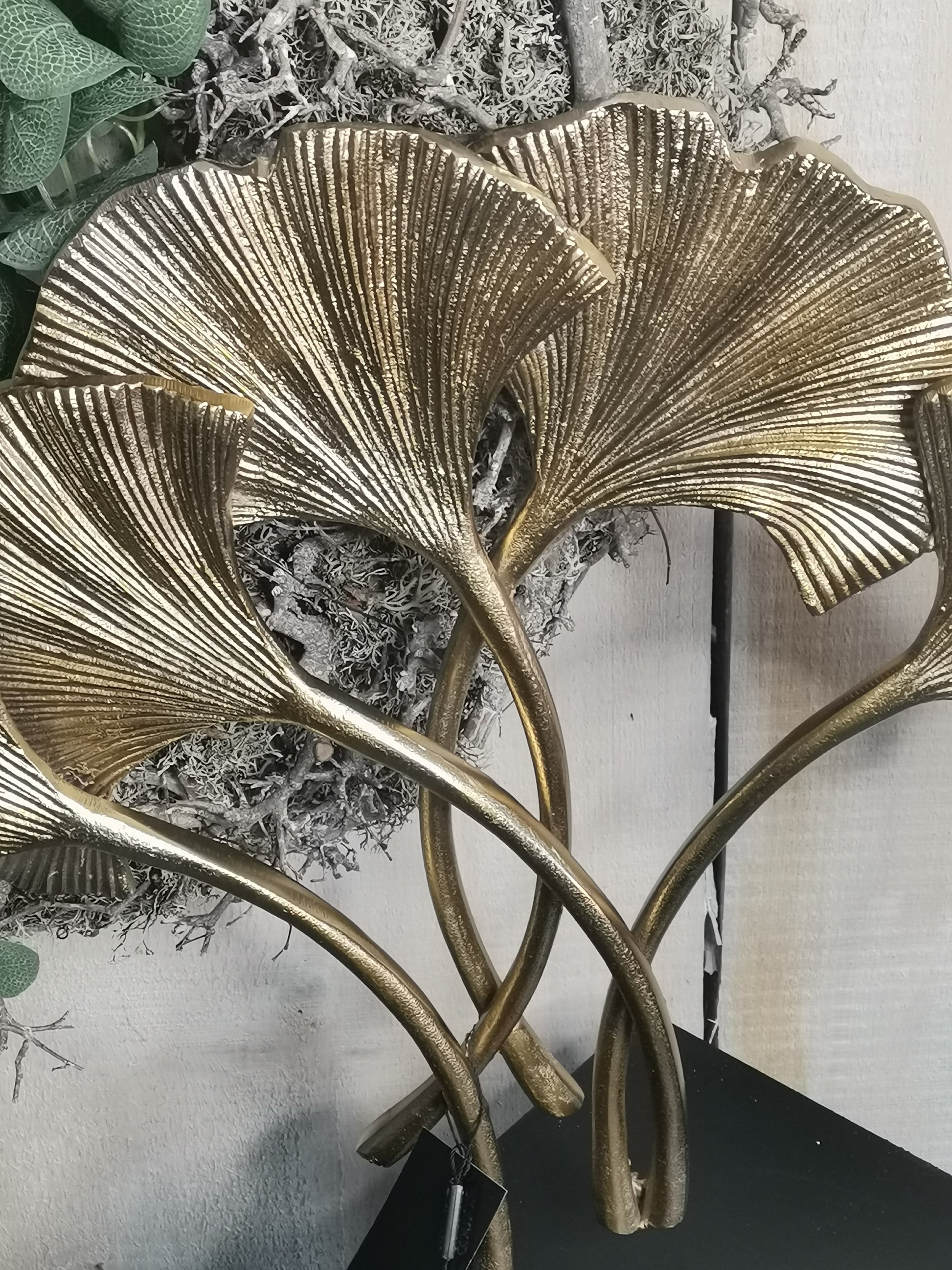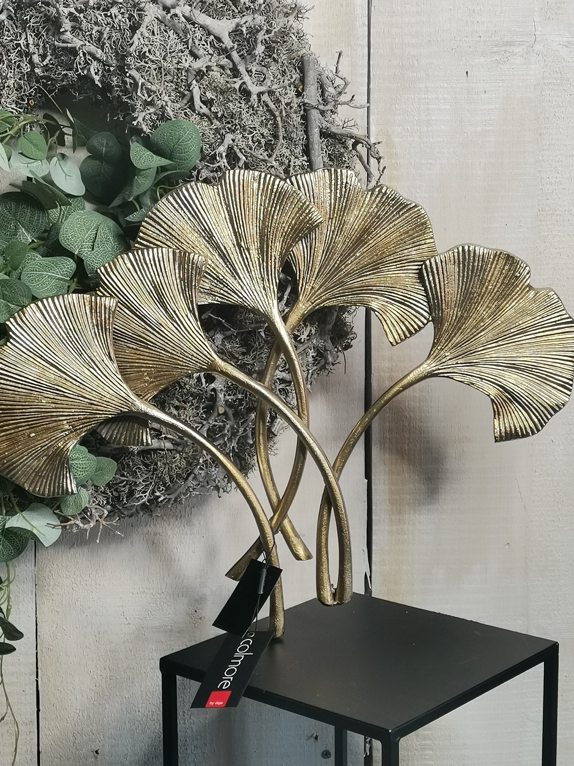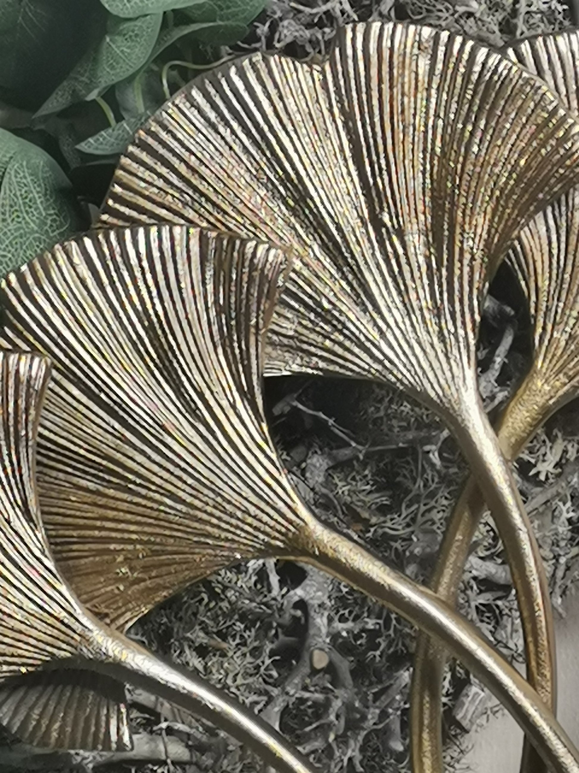 Extravagante Wanddekoration aus 5 Ginkgo Blätter in Alu Bronze/Gold RAW finish, aus dem Hause Colmore. Die Ginkgo Wanddekoration hat eine Länge von 54 cm, eine Breite von 41 cm und steht ungefähr 5 cm von der Wand ab. Durch die 5fache Anordnung der Ginkgo Blätter wirkt es sehr extravagant und ist somit an der Wand, ein echter Hingucker in jedem Wohnbereich. Die Farbe Bronze/Gold lässt sich in jedem Wohnstill toll intrigieren.