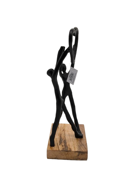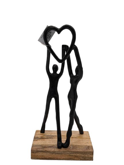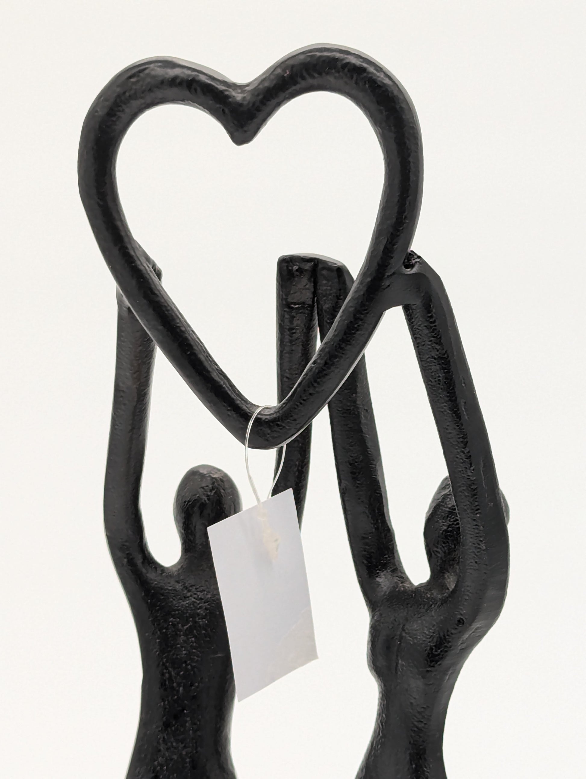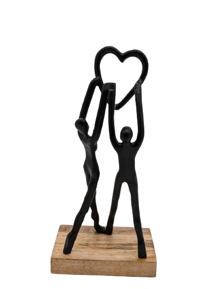Das abstrakt gestaltete Paar aus schwarzem Aluminium hält gemeinsam ein Herz hoch, das in der Mitte der Skulptur schwebt. Das Herz symbolisiert die gemeinsame Liebe und Verbundenheit des Paares, während die reduzierte Formgebung dem Kunstwerk eine moderne und zeitlose Eleganz verleiht.