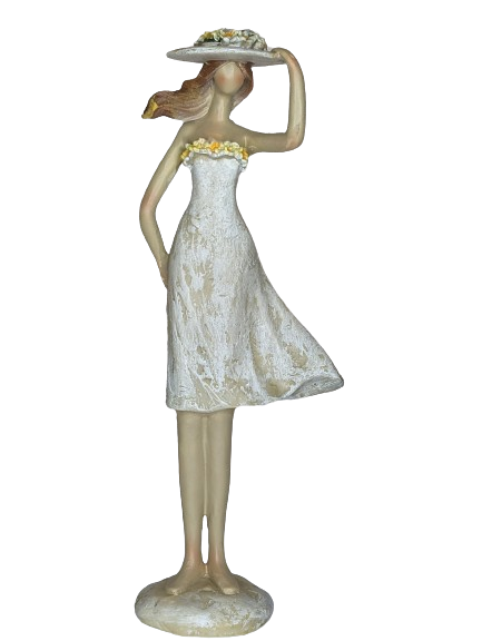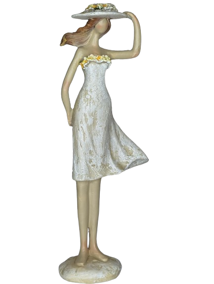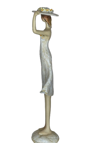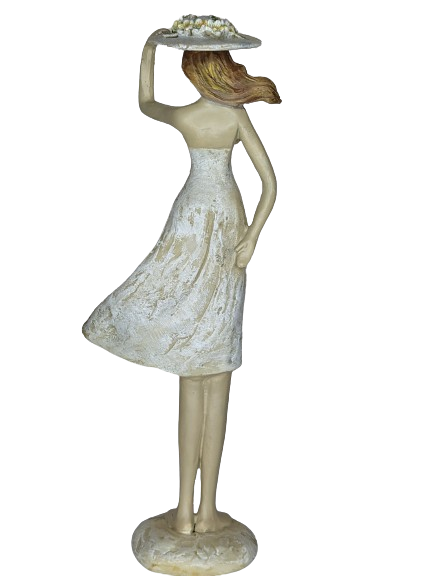 Die Figur zeigt eine Frau mit einem hübschen Hut, der mit Blüten verziert ist, was einen charmanten und femininen Touch verleiht. Die Farbe Creme unterstreicht die zarte und zugleich kraftvolle Ausstrahlung der Figur. Das schwingende Kleid verleiht der Skulptur eine dynamische Note, die Lebendigkeit und Anmut verkörpert.