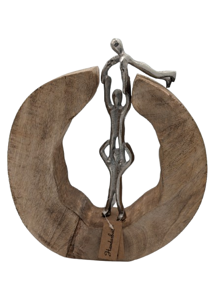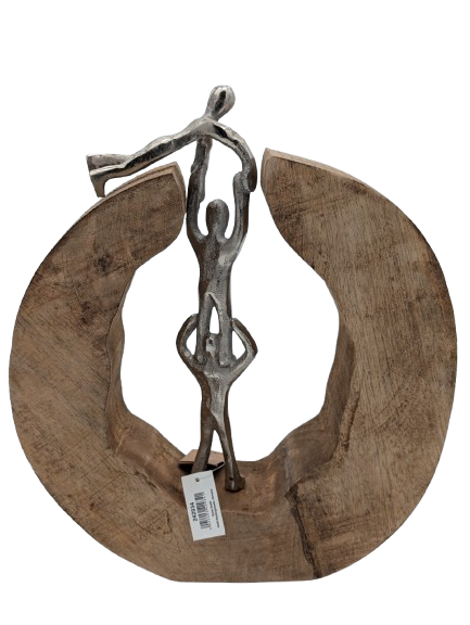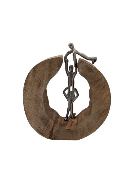 Im Zentrum der Skulptur befindet sich eine offene Mitte, die Leichtigkeit und Raum symbolisiert. Innerhalb dieser offenen Struktur stehen drei abstrakte Figuren aus hochwertigem, silberfarbenem Aluminium. Diese Figuren repräsentieren das Motto „Gemeinsam stark“ und stehen für Zusammenhalt, Gemeinschaft und Stärke.