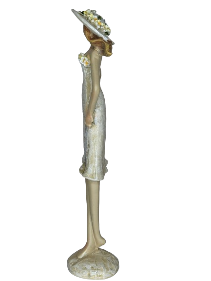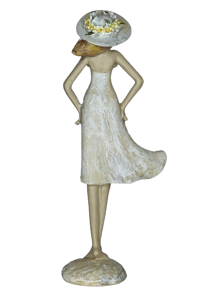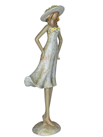 Die Figur zeigt eine Frau mit einem hübschen Hut, der mit Blüten verziert ist, was einen charmanten und femininen Touch verleiht. Die Farbe Creme unterstreicht die zarte und zugleich kraftvolle Ausstrahlung der Figur. Das schwingende Kleid verleiht der Skulptur eine dynamische Note, die Lebendigkeit und Anmut verkörpert.