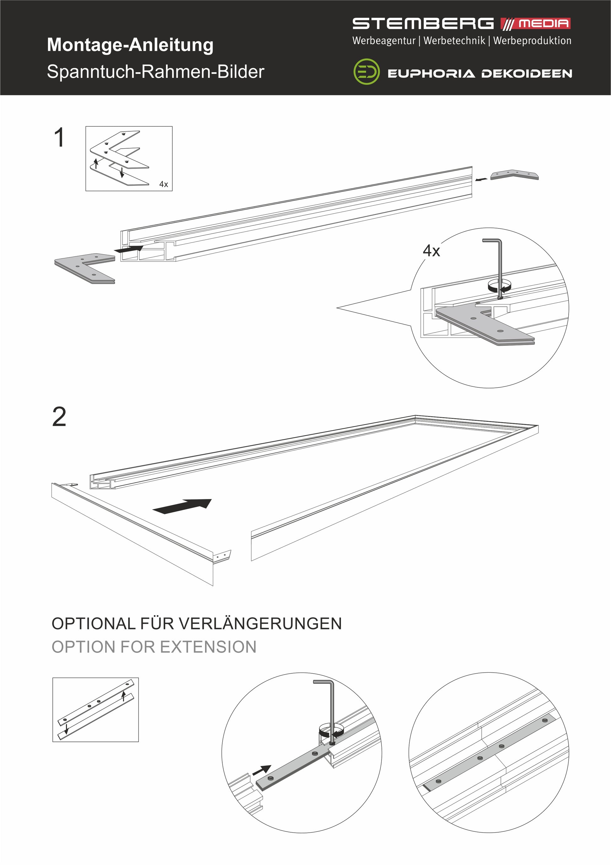 Die Montage des Rahmens ist unkompliziert und erfordern keinen Fachmann oder spezielles Werkzeug. Eine Gummilippe am Spanntuch erleichtert zudem das Anbringen der Bespannung.